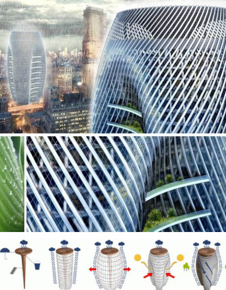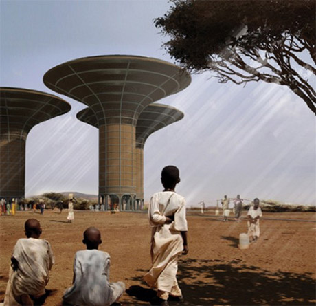蘇丹摩天水塔 在面積廣闊的蘇丹沙漠,淡水成為最寶貴的資源之一,獲取淡水的難度超乎人們想象。有意思的是,沙漠地下深處也隱藏著世界上最大的地下湖,如果能夠有效加以利用,當(dāng)?shù)鼐用竦纳畋銜?huì)發(fā)生翻天覆地的變化。波蘭建筑事務(wù)所H3AR提出了一種解決之道,即建造外形好似當(dāng)?shù)睾锩姘鼧?shù)的水塔群并利用地下泵抽水。水塔內(nèi)建有一個(gè)水處理廠、一所醫(yī)院、一所學(xué)校以及一個(gè)食物儲(chǔ)藏中心。6.集雨摩天樓