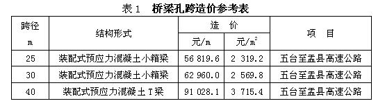 表1為五臺(tái)至盂縣高速公路的代表性孔跨工程造價(jià)表,供估算工程造價(jià)之用。