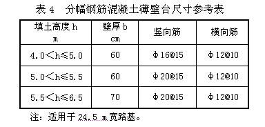 平原區(qū)填土高度h≤6.5 m的小橋,可采用薄壁臺(tái),軟基段宜控制在6.0 m以下。現(xiàn)運(yùn)營的高速路中有些薄壁臺(tái)出現(xiàn)開裂現(xiàn)象,設(shè)計(jì)時(shí)應(yīng)特別引起注意。