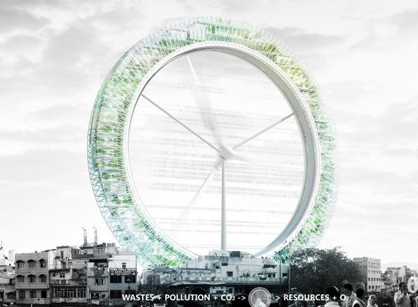 循環(huán)中心是一個大型的風力渦輪,像一個大肺一樣,轉動在新德里城市中心,能量及二氧化碳通過摩天輪里的植物、化學過濾器、微小顆粒的膜結構、高空溫室和礦化設備將氧氣釋放到城市上空。