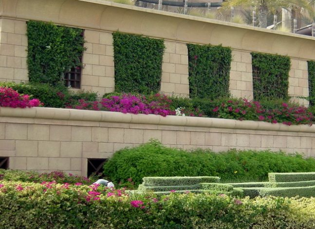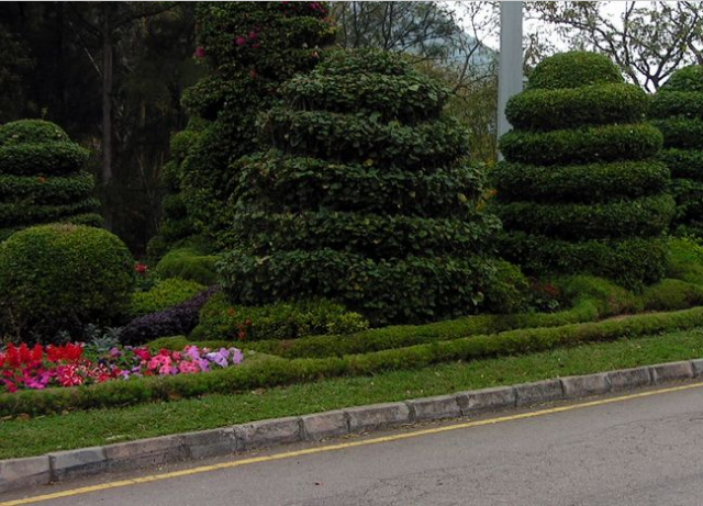 分隔帶綠化的主要功能是按不同的行駛方向分隔車道,防止車燈眩光干擾,減輕對開車輛接近時司機心理上的危險感,或因行車而引起的精神疲勞,引導視線和改善環境。中央分隔帶的設計,在增強交通功能并能夠持久穩定方面,要求考慮通過常綠灌木實現,選擇時應重點考慮選用耐尾氣污染、生長健壯、慢生和耐修剪的灌木品種,一般可選用石楠、金葉女貞、紅花繼木、蜀檜柏、冬青等。在一些地段的分隔帶設計中,還可以組團式規則種植棕櫚、櫻花、西府海棠等特色小喬木來體現植物景觀的差異性。
