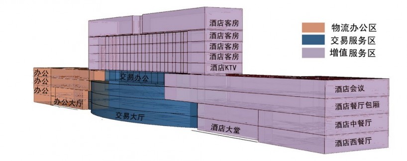 區(qū)別于傳統(tǒng)鐵路貨場散點(diǎn)式的的生產(chǎn)配套房屋布局規(guī)劃,嘉寶物流園區(qū)在西南角集中建設(shè)了一幢九層高,總建筑面積約4.2萬平米的嘉寶物流大廈,作為園區(qū)的標(biāo)志性建筑物及綜合性服務(wù)大樓,其功能不緊緊涵蓋了服務(wù)物流園的基本生產(chǎn)管理功能,同時(shí)也承擔(dān)了為嘉寶物流園區(qū)提供各項(xiàng)增值服務(wù)的經(jīng)濟(jì)開發(fā)功能(圖9)。其主要功能包括:網(wǎng)上交易、流通加工、貨運(yùn)代理、貿(mào)易、金融、工商、咨詢、會議餐飲、酒店住宿等各種綜合服務(wù)性功能(圖10)。集約式的規(guī)劃布局既可以充分提高園區(qū)土地利用率及生產(chǎn)組織管理效率,還可以提升園區(qū)室內(nèi)外環(huán)境品質(zhì),統(tǒng)領(lǐng)園區(qū)的整體形象。
