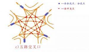 五路交叉口,50個沖突點、8個合流點、分流點。
