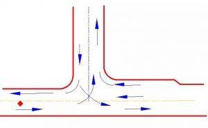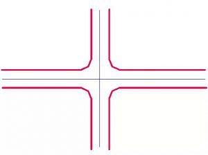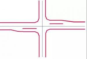 當主要公路的直行、轉彎交通量較大時,則采用在主要公路和次要公路上均設分隔島的渠化T形交叉。