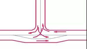 若無左轉彎車輛,四路交叉的沖突點由原來的16個減至4個。