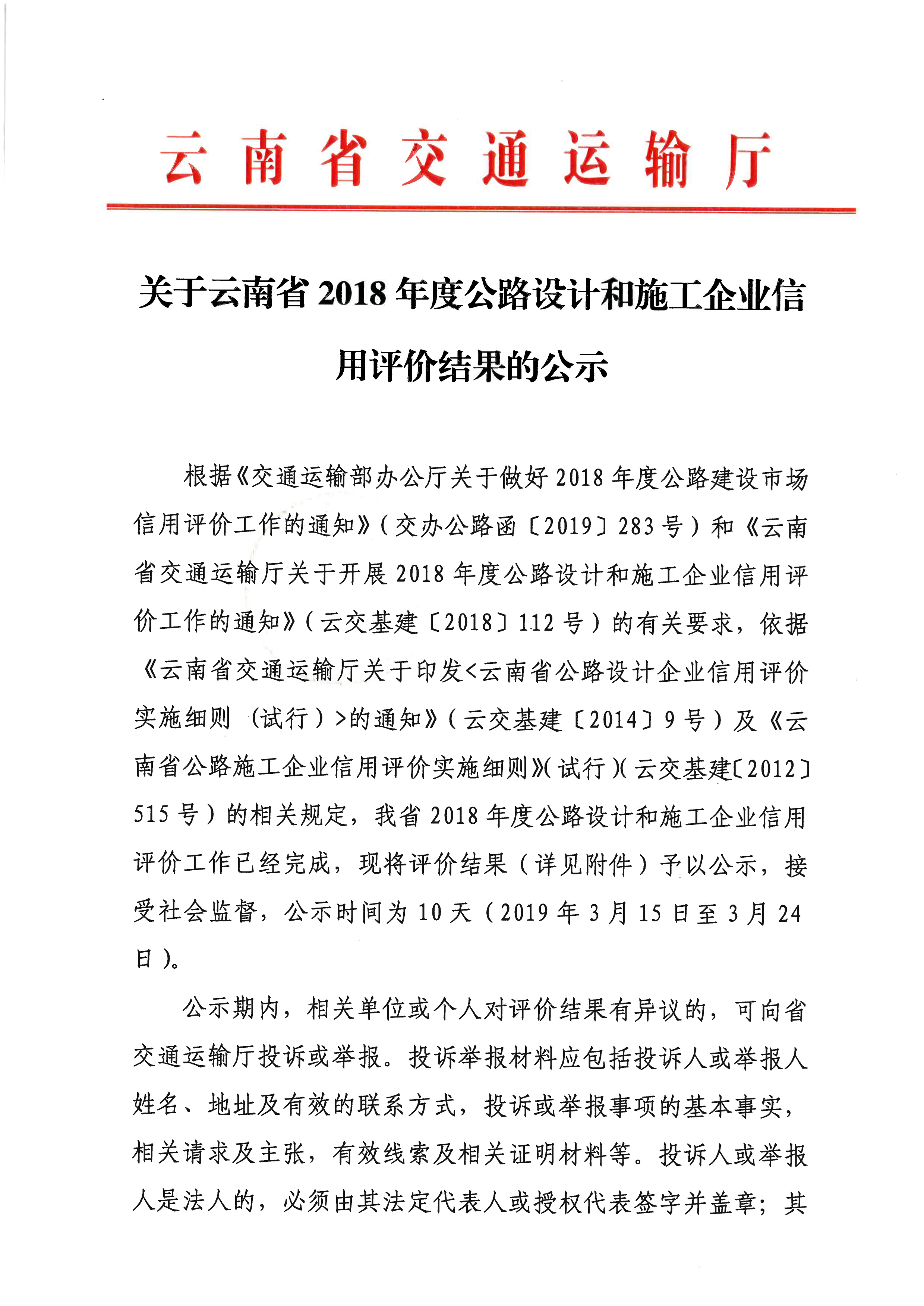 云南省2018年度公路設(shè)計(jì)和施工企業(yè)信用評價結(jié)果的公示