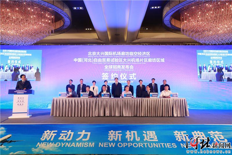 10月10日,北京大興國(guó)際機(jī)場(chǎng)廊坊臨空經(jīng)濟(jì)區(qū)·中國(guó)(河北)自由貿(mào)易試驗(yàn)區(qū)大興機(jī)場(chǎng)片區(qū)廊坊區(qū)域全球系列招商發(fā)布會(huì)在石家莊市舉行。圖為簽約儀式。 通訊員陳童攝