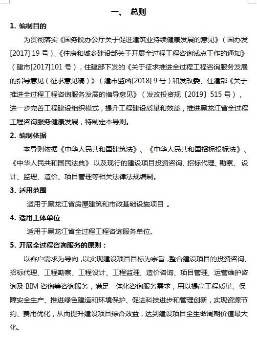 為貫徹落實(shí)《國務(wù)院辦公廳關(guān)于促進(jìn)建筑業(yè)持續(xù)健康發(fā)展的意見》(國辦發(fā)[2017]19號(hào))、《住房和城鄉(xiāng)建設(shè)部關(guān)于開展全過程工程咨詢?cè)圏c(diǎn)工作的通知》(建市[2017]101號(hào)),住建部下發(fā)的《關(guān)于征求推進(jìn)全過程工程咨詢服務(wù)發(fā)展的指導(dǎo)意見(征求意見稿)》(建市監(jiān)函[2018]9號(hào))和發(fā)改委、住建部《關(guān)于推進(jìn)全過程工程咨詢服務(wù)發(fā)展的指導(dǎo)意見》(發(fā)改投資規(guī)〔2019〕515號(hào)),進(jìn)一步完善工程建設(shè)組織模式,提升工程建設(shè)質(zhì)量和效益,推進(jìn)黑龍江省全過程工程咨詢服務(wù)健康發(fā)展,特制定本導(dǎo)則。