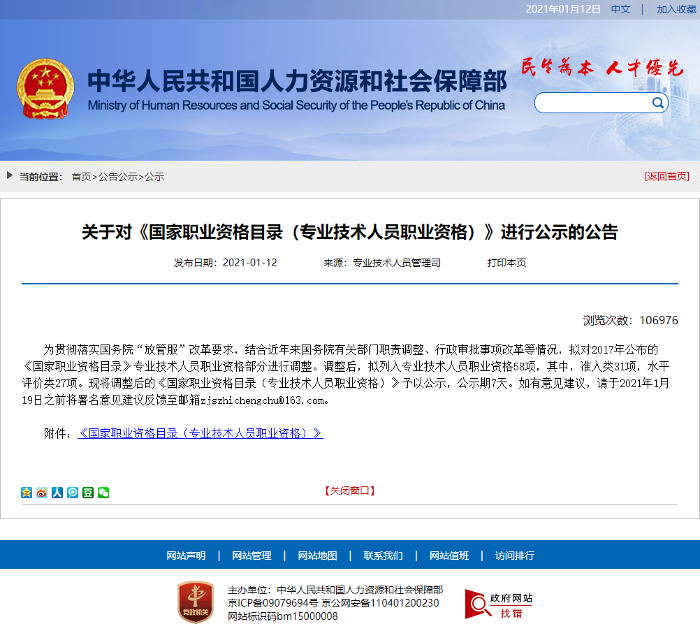 為貫徹落實(shí)國務(wù)院“放管服”改革要求,結(jié)合近年來國務(wù)院有關(guān)部門職責(zé)調(diào)整、行政審批事項(xiàng)改革等情況,擬對2017年公布的《國家職業(yè)資格目錄》專業(yè)技術(shù)人員職業(yè)資格部分進(jìn)行調(diào)整。調(diào)整后,擬列入專業(yè)技術(shù)人員職業(yè)資格58項(xiàng),其中,準(zhǔn)入類31項(xiàng),水平評價(jià)類27項(xiàng)。現(xiàn)將調(diào)整后的《國家職業(yè)資格目錄(專業(yè)技術(shù)人員職業(yè)資格)》予以公示,公示期7天。如有意見建議,請于2021年1月19日之前將署名意見建議反饋至郵箱zjszhichengchu@163.com。