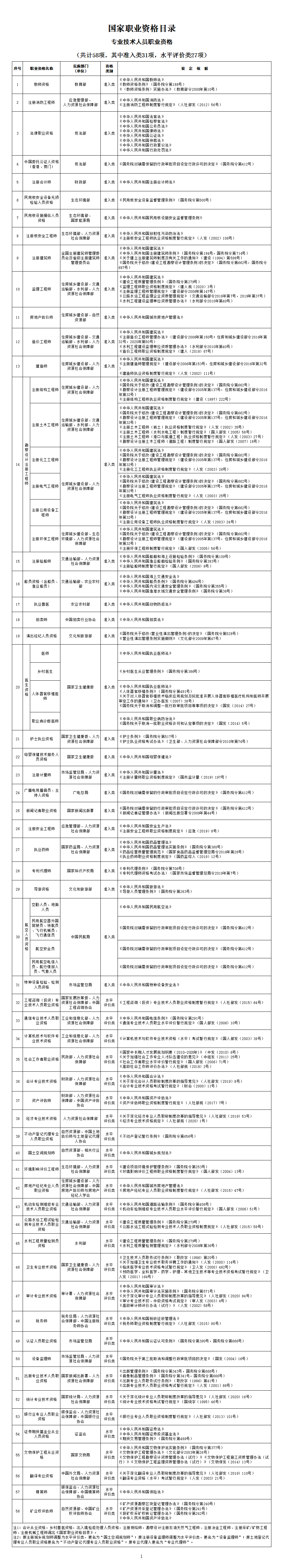 注1:會計(jì)從業(yè)資格,鄉(xiāng)村獸醫(yī)資格,出入境檢疫處理人員資格,注冊測繪師,勘察設(shè)計(jì)注冊石油天然氣工程師、注冊冶金工程師、注冊采礦/礦物工程師、注冊機(jī)械工程師調(diào)出《國家職業(yè)資格目錄》。