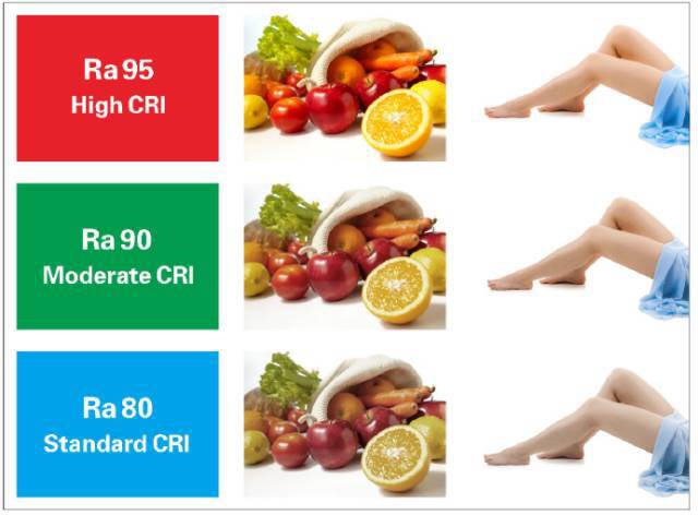 是指物體被光源發(fā)出的光照明時色彩被還原的真實程度。白熾燈的顯色指數為100,也就是說它對于色彩的還原性可以做到100%。現在市面上對于LED光源的應用越來越普及,住宅照明產品光源的顯色指數都應該要大于80,優(yōu)質LED光源的顯色指數能達到90以上甚至95,但是有一大部分的劣質產品其光源的顯色指數都不到70,所以用戶在選擇的時候一定要引起注意。下面關于顯色指數的對比圖可以有一個相對直觀的感受: