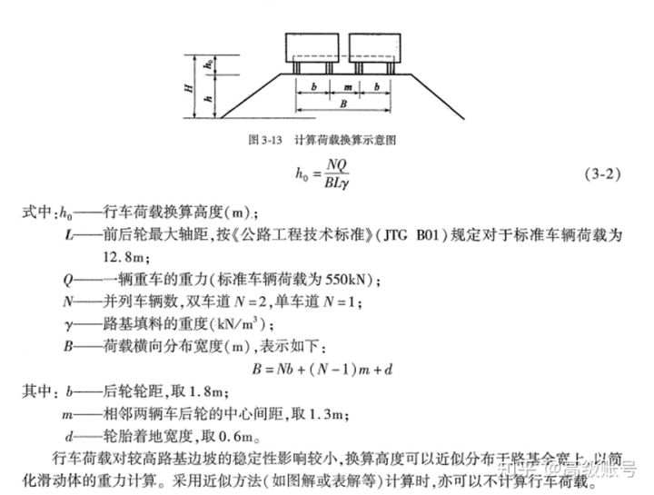 在《公路路基設(shè)計(jì)規(guī)范》(JTG D30-2015)中沒(méi)有發(fā)現(xiàn)對(duì)邊坡穩(wěn)定計(jì)算時(shí)行車(chē)荷載如何考慮的條文,但是在《路基路面工程》(黃曉明版)和《公路軟土地基路堤設(shè)計(jì)與施工技術(shù)細(xì)則》(JTG/T D31-02-2013)中有相關(guān)表述。《公路軟土地基路堤設(shè)計(jì)與施工技術(shù)細(xì)則》4.1.4-4.1.6條的規(guī)定如下,即將行車(chē)荷載換算成土柱高度,可按車(chē)輛荷載均布于車(chē)輛投影面積上換算得出。