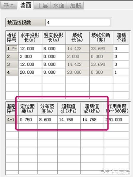 那么是不是直接勾選單列車(chē)隊(duì)或雙列車(chē)隊(duì)就可以了呢,如果單向有四個(gè)車(chē)道呢,分布四列車(chē)是不是更偏向不穩(wěn)定?因此,建個(gè)簡(jiǎn)單粗糙的模型對(duì)比一下。在理正邊坡中建了個(gè)高度16m的路堤,其余條件保持一致,只有施加的超載位置、分布寬度和強(qiáng)度值不同。