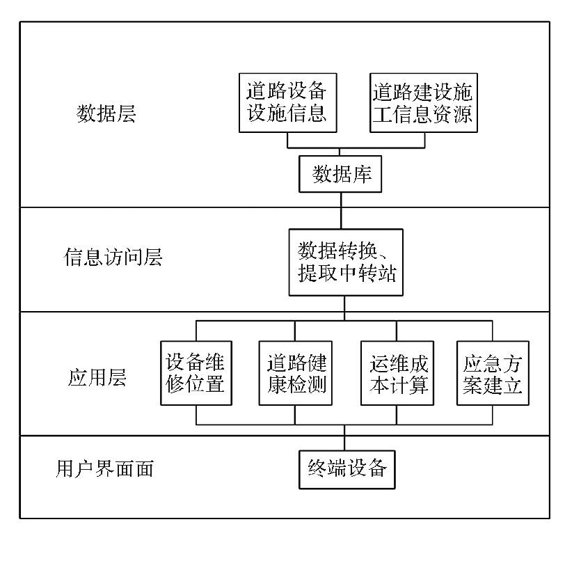 道路工程的維護工作是一項復雜的系統工程,它需聯系到道路工程的建設、施工階段的信息資料,而且具有專業性強、機動化程度高,時效性強等特點,同時,國內道路工程的維護存在新設備投入率低[9],作業信息化程度低[6],維護經費匱乏等現狀。因而,運用BIM技術建立道路工程運維管理平臺,整合道路設計、施工階段的工程信息資源,解決建設和養護階段的信息分離問題,實現設備故障報修,定期定段養護提醒以及智能化維護尤為必要。通過三維模型進行設備設施的統一編碼,該編碼作為唯一標識載入數據庫,同時保存道路建設、施工階段的信息資料,另外結合GIS數據庫信息形成數據庫,各個相關方對數據庫中信息進行提取、篩選,實時掌握道路運行情況和設備維修位置,進行健康檢測和信息化管理。道路工程運維管理平臺的框架圖如圖4。