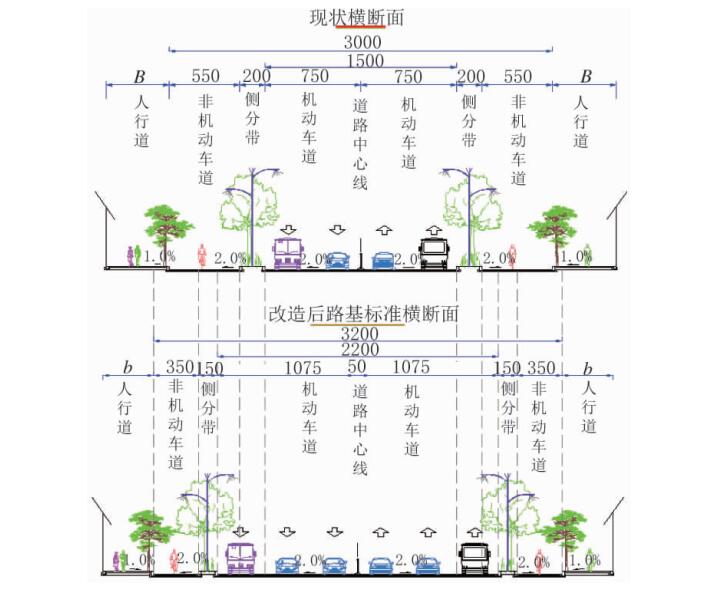 道路現狀為雙向 4 車道,橫斷面布置為 B 人行道 +5.5 m 非機動車道 +2 m 側分帶 +15 m 機動車道 +2 m 側分帶 +5.5 m 非機動車道 +B 人行道,B 現狀寬度為不小于 5.5 m。