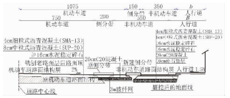 (2)針對拆除側分帶、壓縮非機動車道改建為機動車道段,建議采用 20 cm C20 混凝土進行處理,新舊路基搭接頂面鋪設 3 m 玻纖網防止反射裂縫產生。
