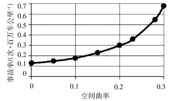 在開(kāi)展公路路線設(shè)計(jì)安全性評(píng)價(jià)中,為了提高設(shè)計(jì)的合理性,還要構(gòu)建完善的系統(tǒng)分析和評(píng)價(jià)模型,主要包括行車(chē)安全事故發(fā)生概率與空間曲率指標(biāo)模型的評(píng)價(jià)。及時(shí)通告公路實(shí)際情況,結(jié)合現(xiàn)代公路安全角度進(jìn)行評(píng)價(jià),明確公路線路設(shè)計(jì)項(xiàng)目的完整性搜集,同時(shí)構(gòu)建完善的模型曲線關(guān)系,相關(guān)專(zhuān)業(yè)人士的空間曲率和安全事故發(fā)生率直接的曲線關(guān)系如圖1所示。