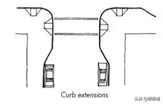 此外,在居住區或是有路側停車的城市支路,可將交叉口進行縮窄設計,以減小行人過街距離,進一步降低車輛轉彎速度、保障行人安全。