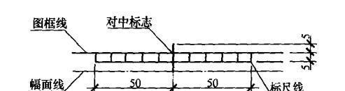 (2)需要縮微后存檔或復制的圖紙,圖框四邊均應具有位于圖幅長邊,短邊重點的對中標志(圖2-1),并應在下圖框線的外側,繪制一段長100cmm標尺,其分隔為10mm。對中標志的線寬宜采用大于或等于0.5mm,標尺線的線寬宜采用0.25mm的實線繪制(圖2-2)