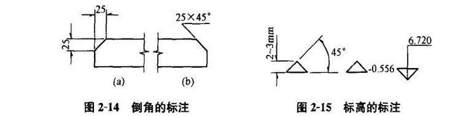 (12)倒角尺寸可按圖2-14 (a)標注,當倒角為45“時,也可按圖2-14(b)標注。