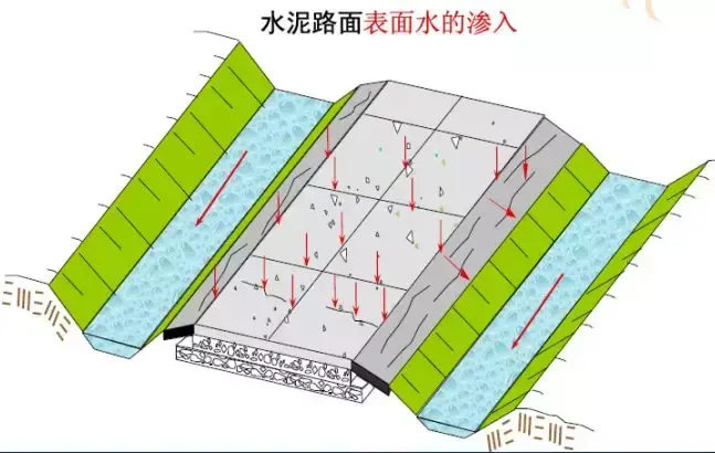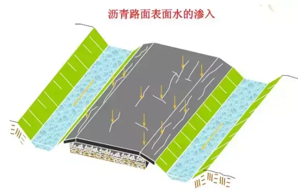 路面結(jié)構(gòu)內(nèi)部水的危害:浸濕各結(jié)構(gòu)層材料和路基土,易造成無粘結(jié)粒狀材料和地基土的強(qiáng)度降低;使水泥混凝土路面產(chǎn)生唧泥,隨之出現(xiàn)錯臺、開裂和整個路肩破壞;進(jìn)入空隙的自由水在行車荷載的作用下,會形成高孔隙水壓力和高流速的水流,引起路面基層的細(xì)顆粒產(chǎn)生唧泥,結(jié)果失去支承;在冰凍深度大于路面厚度的地方,高地下水位會造成凍脹,并在凍融期間降低承載能力;水使凍脹土產(chǎn)生不均勻凍脹;與水經(jīng)常接觸將使瀝青混合料剝落,影響瀝青混凝土耐久性和產(chǎn)生龜裂。