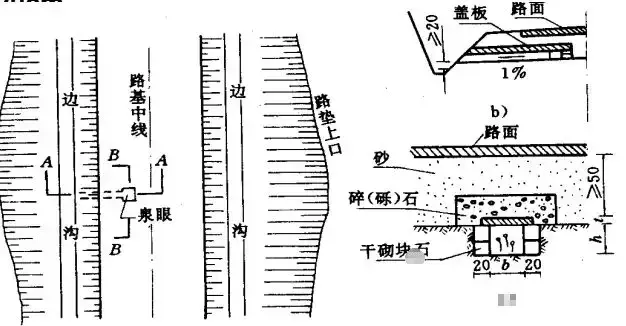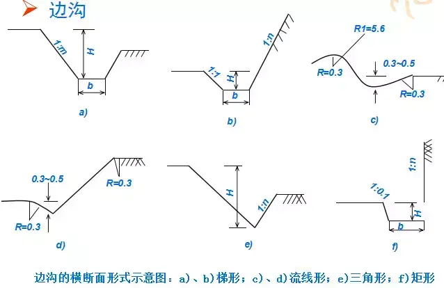 1.邊溝:邊溝用于匯集和排除降落在路基范圍內(nèi)以及流向路基的少量地表水。邊溝設(shè)置在挖方路基的路肩外側(cè)或低路堤的坡腳外側(cè),多與路中線平行,用以匯集和排除路基范圍內(nèi)流向路基的少量地面水。