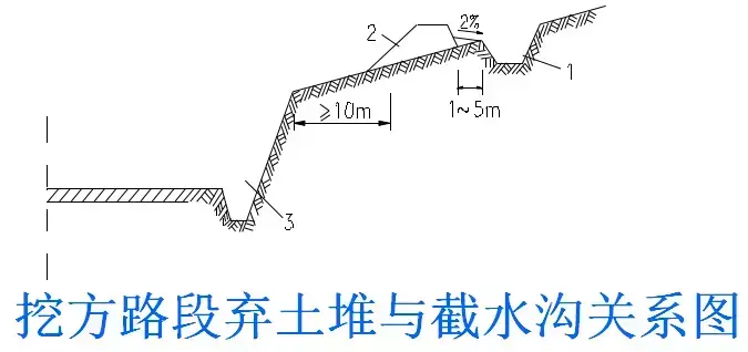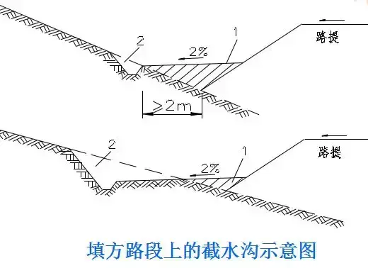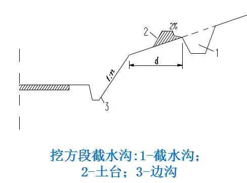 2.截水溝:又稱天溝,一般設(shè)置在挖方路基邊坡坡頂以外,或山坡路堤上方的適當(dāng)?shù)攸c,用以攔截并排除路基上方流向路基的地面徑流。
