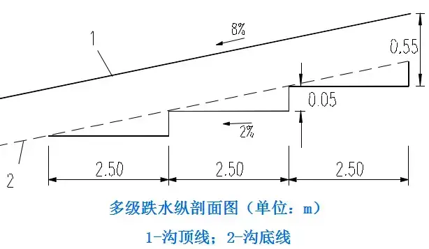 跌水構(gòu)造:單級和多級之分,溝底有等寬與變寬之別。基本構(gòu)造可分為進(jìn)水口、消力池和出水口三個部分。