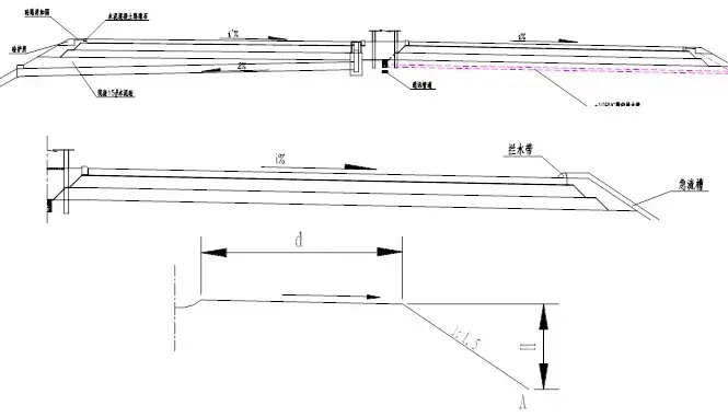 降落在路面上的雨水,應(yīng)通過路面橫向坡度向兩側(cè)排流,避免行車道路路面范圍內(nèi)出現(xiàn)積水。在路線縱坡平緩、匯水量不大、路堤較低且邊坡坡面不會受到?jīng)_刷的情況下,應(yīng)采用在路堤邊坡上橫向漫坡的方式排除路面表面水。