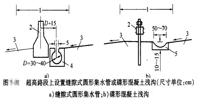 (1)寬度小于3m且表面采用鋪面封閉的中央分隔帶排水,降落在分隔帶上的表面水排向兩側(cè)行車道,其坡度與路面的橫坡度相同;在超高路段上,可在分隔帶上側(cè)邊緣處設(shè)置緣石或泄水口,或者在分隔帶內(nèi)設(shè)置縫隙式圓形集水管或碟形混凝土淺溝和泄水口,以攔截和排泄上側(cè)半幅路面的表面水。緣石過水?dāng)嗝娴男顾诳刹捎瞄_口式,格柵式或組合式;碟形混凝土淺溝的泄水口采用格柵式。