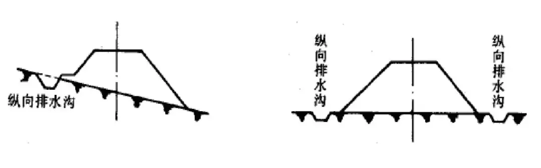 上圖用于排出路堤范圍內(nèi)的地面水:當?shù)孛嫫教箷r設于路基的兩側(cè);當?shù)孛孑^陡時可設置于迎水面一側(cè)。