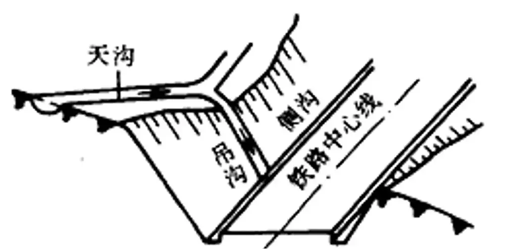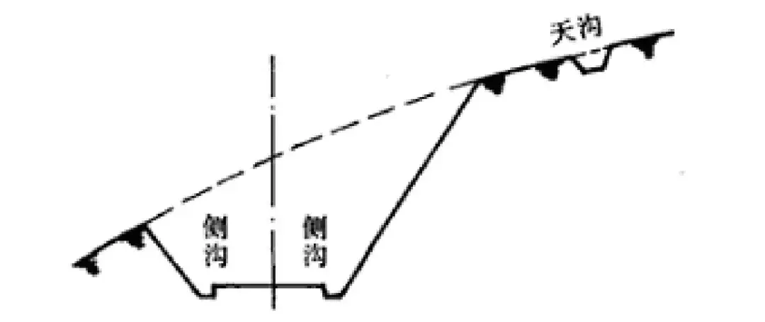 天溝設于路塹塹頂,用以排除山坡迎水方向流向路塹的地面水。路塹頂部無棄土堆時,天溝內(nèi)邊緣至塹頂距離不宜小于5m;當溝內(nèi)進行加固防滲時不應小于2m。