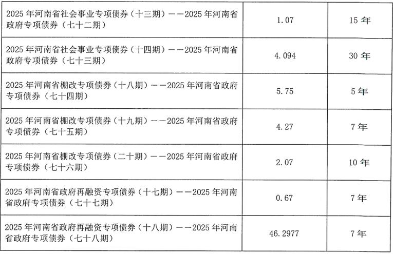 2025年河南省政府專項(xiàng)債券(七十七期)擬發(fā)行金額0.67億元,用于償還2020年河南省棚改專項(xiàng)債券(四期)-2020年河南省政府專項(xiàng)債券(四十一期)的部分本金。